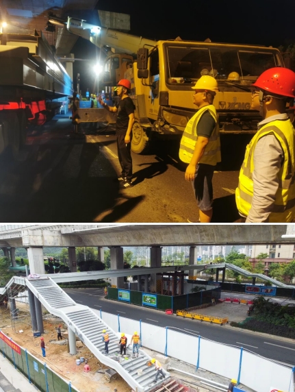 由于人行天橋項(xiàng)目建設(shè)所處的位置地下含高壓線等管線,施工環(huán)境較為復(fù)雜,且又處在交通通行量大的東環(huán)高速高架橋下,由于空間受限,鋼箱梁吊裝與高架橋最近的距離僅有5公分,吊裝難度極大。為此,我們采取雙吊車協(xié)同施工、錯(cuò)峰施工和夜間施工的辦法。為確保施工安全,市政集團(tuán)從上至下高度重視,由集團(tuán)領(lǐng)導(dǎo)帶隊(duì),項(xiàng)目總工及各職能部門主要人員齊上陣,從交通協(xié)調(diào),運(yùn)梁車跟隨指導(dǎo),安全措施落實(shí)及現(xiàn)場架梁的線位等多方面進(jìn)行把控,主要負(fù)責(zé)人靠前指揮,帶領(lǐng)黨員干部及時(shí)協(xié)調(diào)解決吊裝過程中遇到的問題,充分發(fā)揮出黨支部戰(zhàn)斗堡壘和黨員的模范帶頭作用。